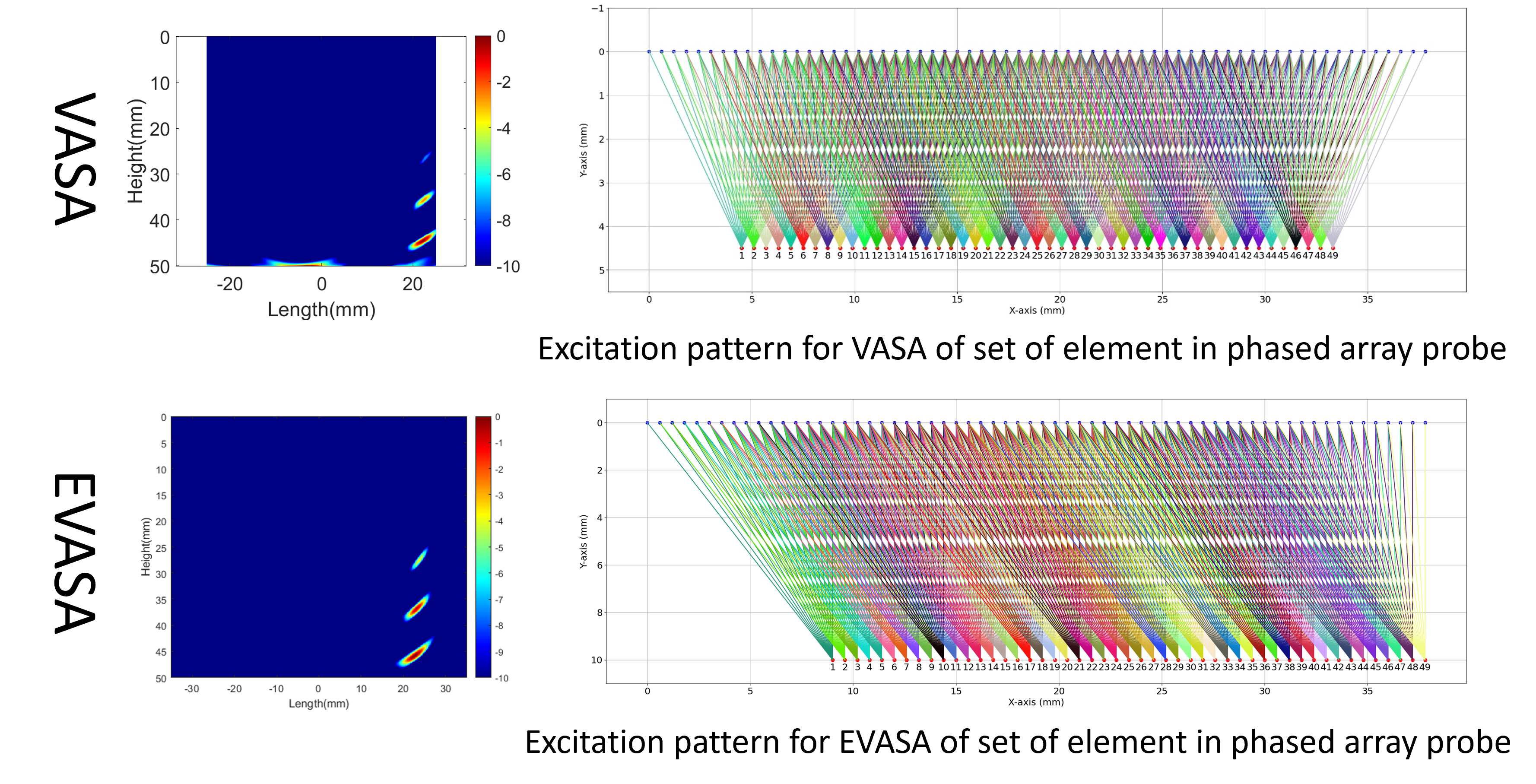 The EVASA method employs a custom algorithm where array elements transmit ultrasound waves with pre-calculated delay laws, achieving beamforming focused at eccentric virtual sources located beneath the transducer. These virtual sources will focus at particular depth and angle and send a high amplitude wave into material. Once the desired set of eccentric virtual sources is formed within the material, the synthetic algorithms of FMC/TFM can be used to image the regions of the material. The parameters for these virtual sources, including the number, aperture position, and locations within the material, are based on the propagation angle and focal depth, extending up to the near-field distance. Comparative evaluation with FMC/TFM, using metrics such as SNR, API, defect size, and image processing time, shows significant improvements. EVASA is implemented using standard PAUT probes and instruments, requiring only customization in focal laws and reconstruction algorithms.