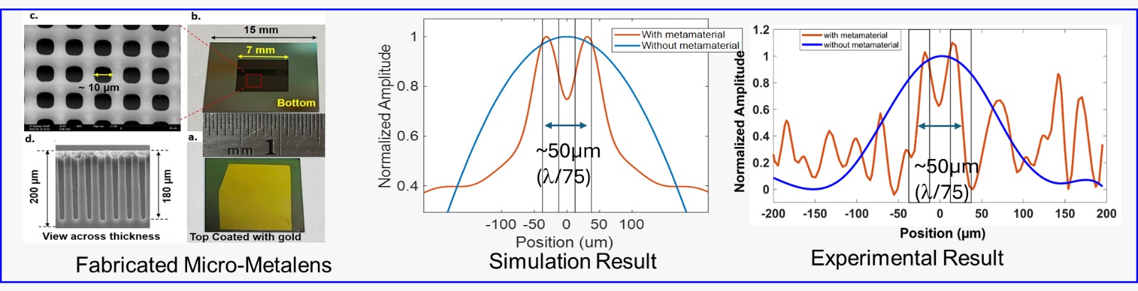 This work presents a novel methodology to image defects inside samples using a narrow band conventional phased array probes to capture the amplified evanescent fields transmitted through the subwavelength features of SCM in both pulse-echo and through transmission modes. Simulations are performed to optimize the structured channel metalens. In finite element models, ultrasonic waves are assumed to impinge on the side drill holes (defects) in a normal incidence both in pulse-echo and through transmission configuration. A line-scan image at the receiver location is generated based on the captured waves according to the pitch of the conventional phased array probes past the metalens. The simulations are validated with experiments conducted in a similar fashion.